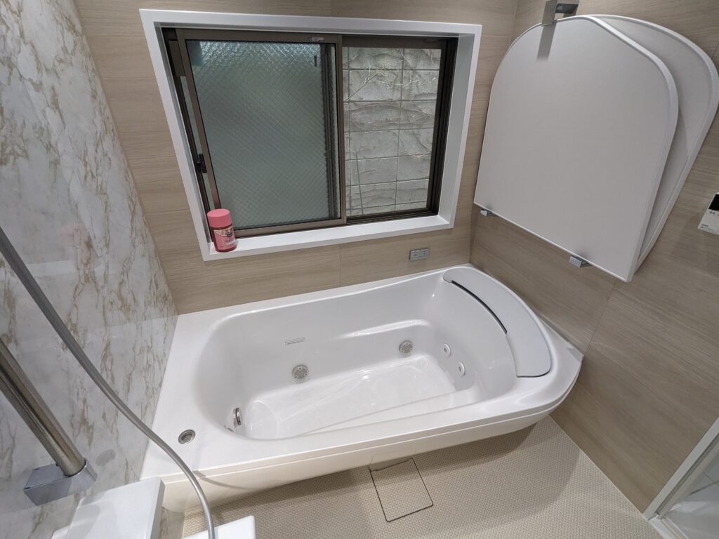 モダンなマーブル柄をアクセントとし、片湯(TOTOでは楽湯という名称)や調光照明付きカウンターなどのシンラの機能を存分につけた商品を納品させていただきました。