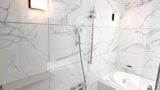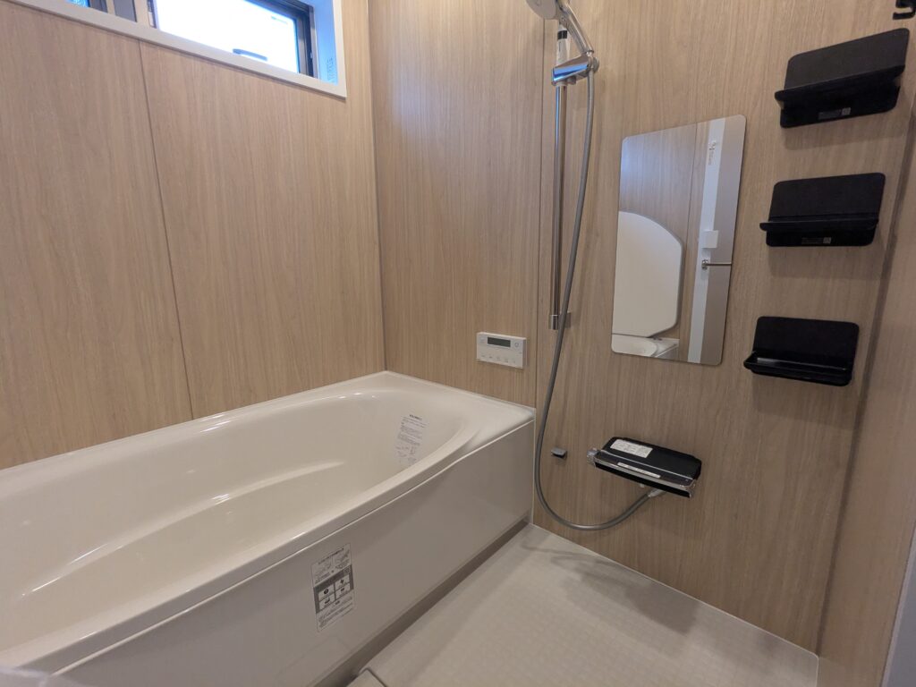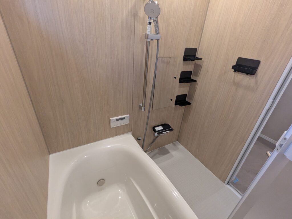 浴槽はツルッとしていて質感の良いリクシルのミナモ浴槽、棚類に関してはマグネットでつくタイプなので清掃性に優れています。